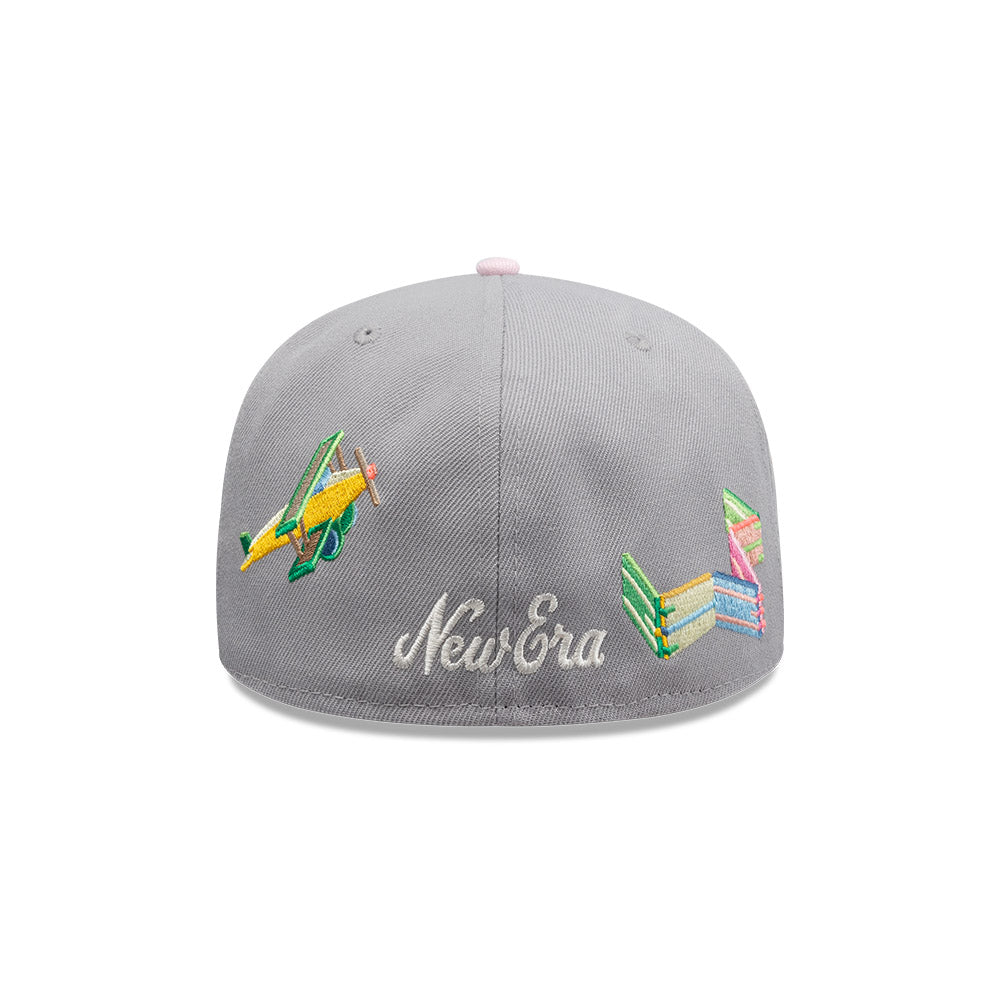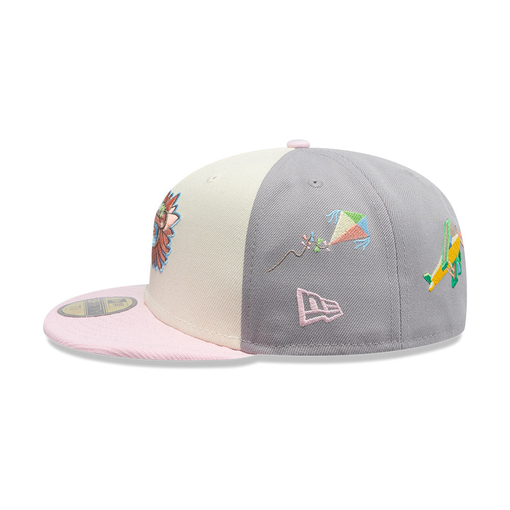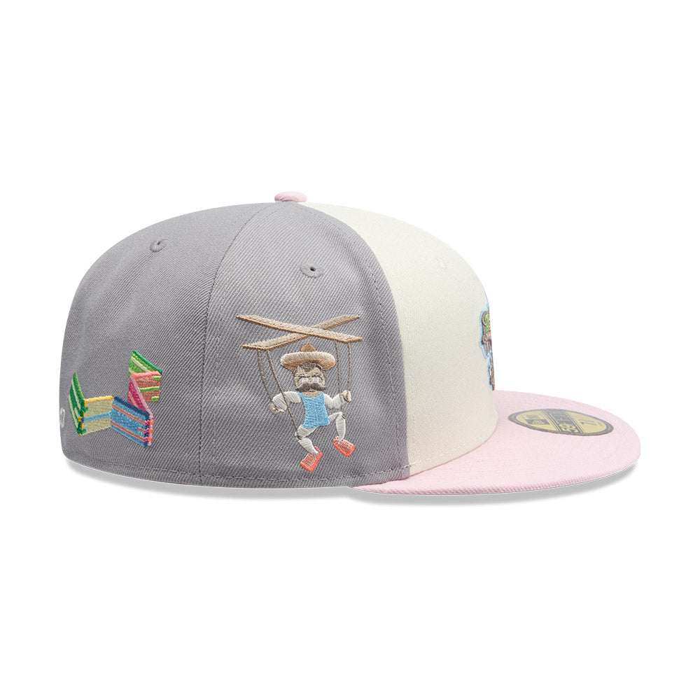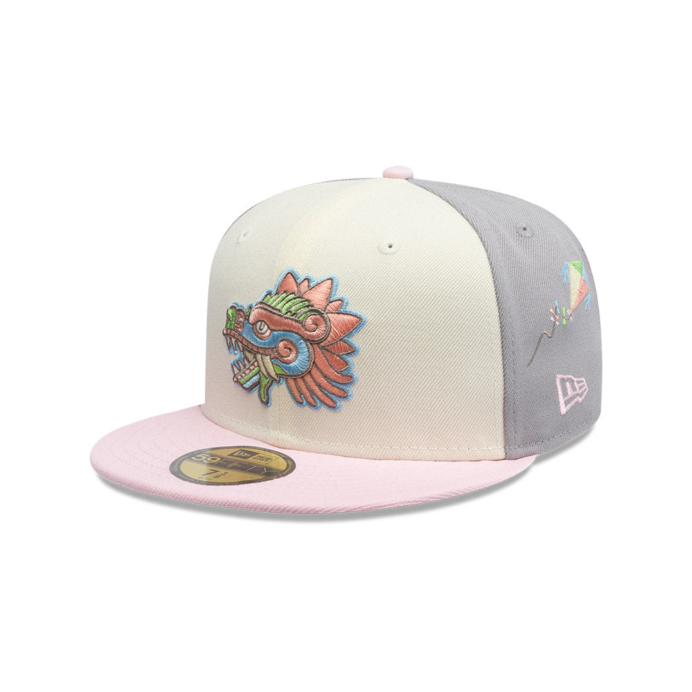 Esta gorra plana New Era 59FIFTY de la colección Juguetes presenta un diseño con Quetzalcóatl bordado en los paneles frontales, juguetes tradicionales mexicanos bordados en las laterales y al reverso, y el flag de New Era bordado del lado izquierdo. Cómprala ya.
