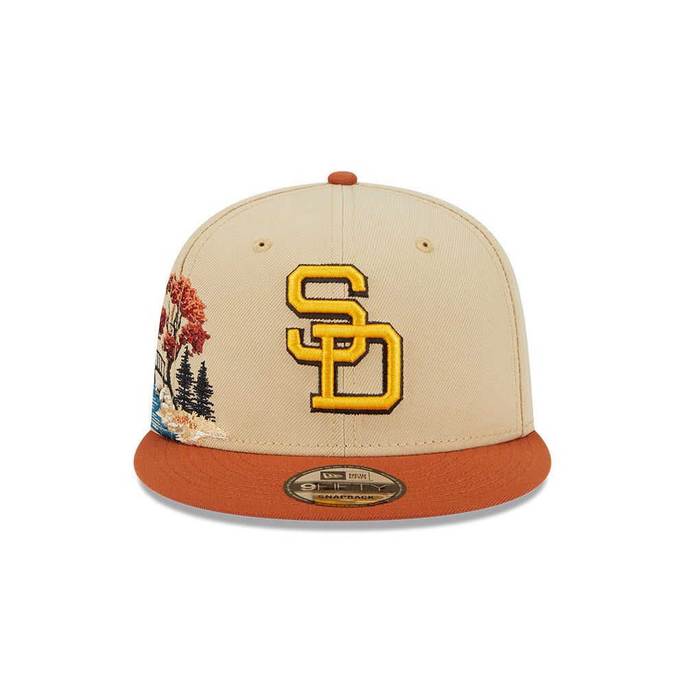 Esta gorra plana New Era 9FIFTY de San Diego Padres de la colección MLB Fall Landscape presenta un diseño inspirado en la estación de otoño con el logotipo de los Padres bordado en los paneles frontales, un paisaje otoñal del lado derecho y el flag de New Era bordado del lado izquierdo. Cómprala ya.