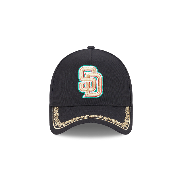 Esta gorra curva New Era 9FORTY A-Frame de San Diego Padres de la colección MLB Ornate Visor presenta el logotipo de los Padres bordado en color dorado con el contorno de los colores patrios en los paneles frontales, detalles bordados en dorado en el visor y el flag de New Era bordado del lado izquierdo. Cómprala ya.