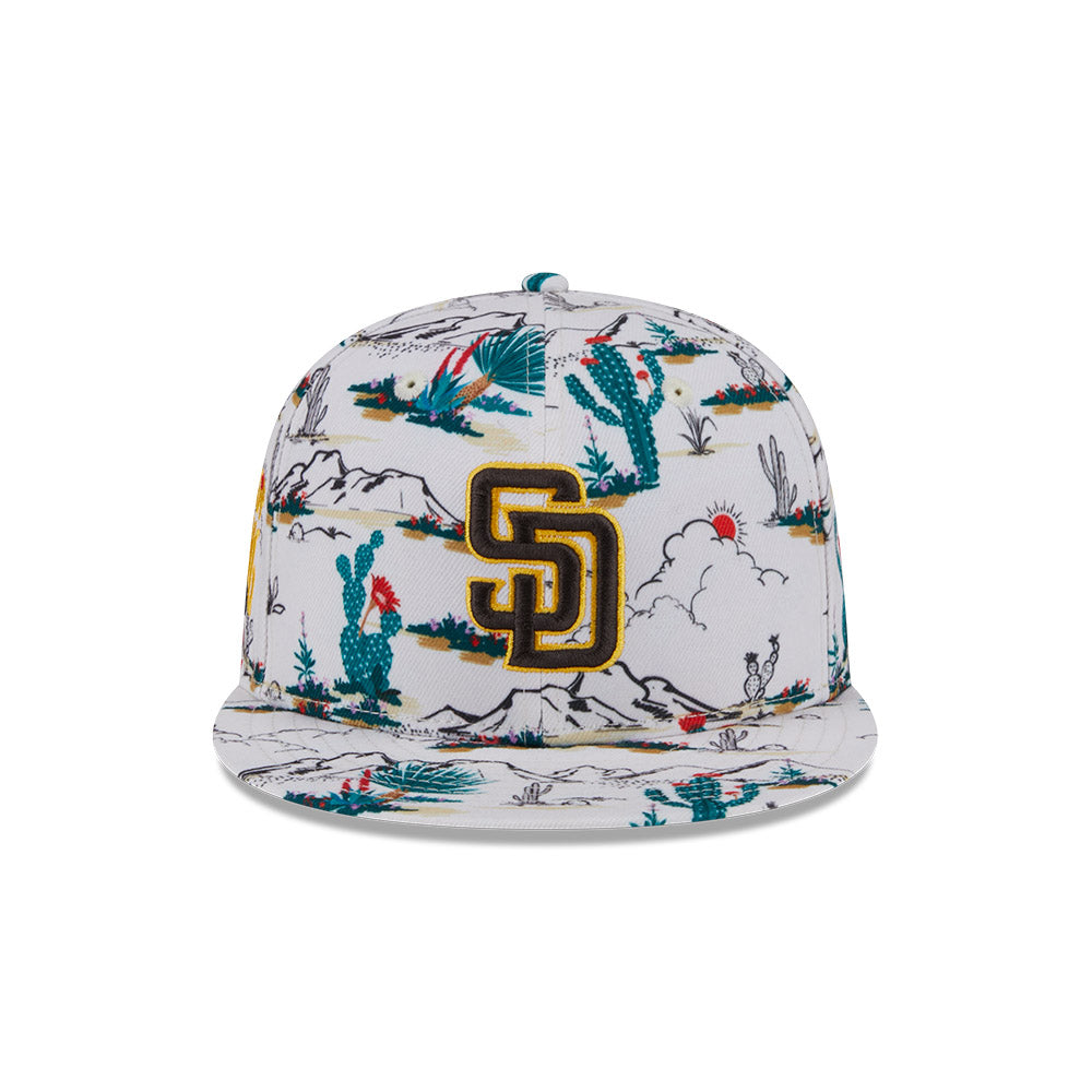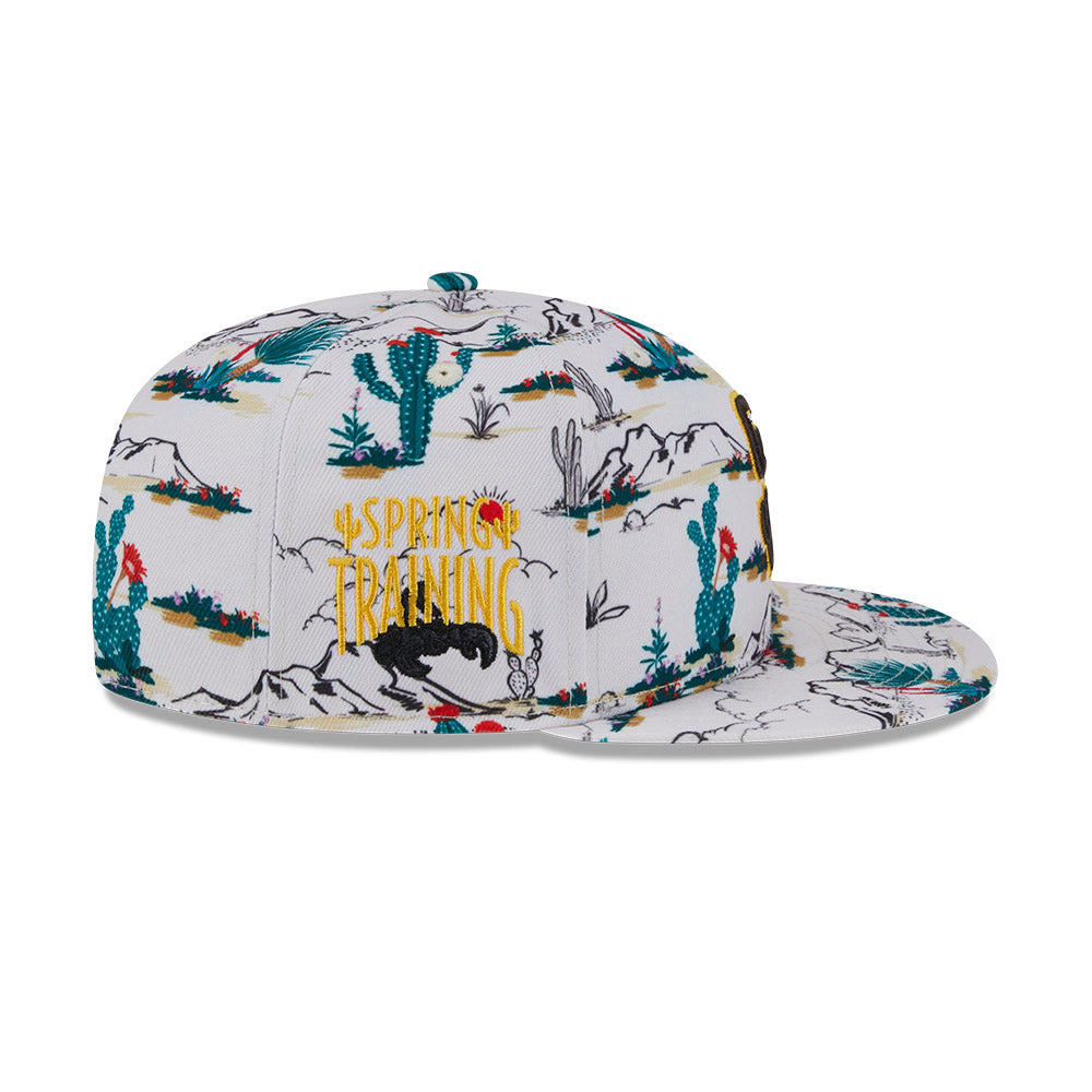 Esta gorra plana New Era 9FIFTY de San Diego Padres de la colección MLB Spring Training Fan Pack 2025 presenta un all over print de un paisaje desértico con el logotipo de los Padres bordado en los paneles frontales, Spring Training bordado del lado derecho y el flag de New Era bordado del lado izquierdo. Cómprala ya.