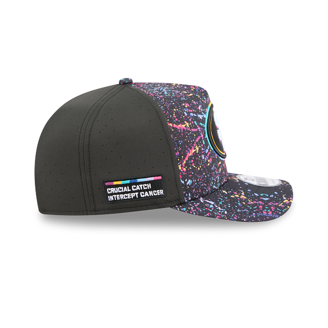 Esta gorra curva New Era 9FIFTY A-Frame de San Francisco 49Ers de la colección NFL Crucial Catch 2025 presenta un diseño de salpicaduras con el logotipo de los 49Ers bordado en el panel frontal, parche Crucial Catch Intercept Cancer del lado derecho, el logo de la NFL en la parte de atrás y el flag de New Era bordado el lado izquierdo. Cómprala ya.