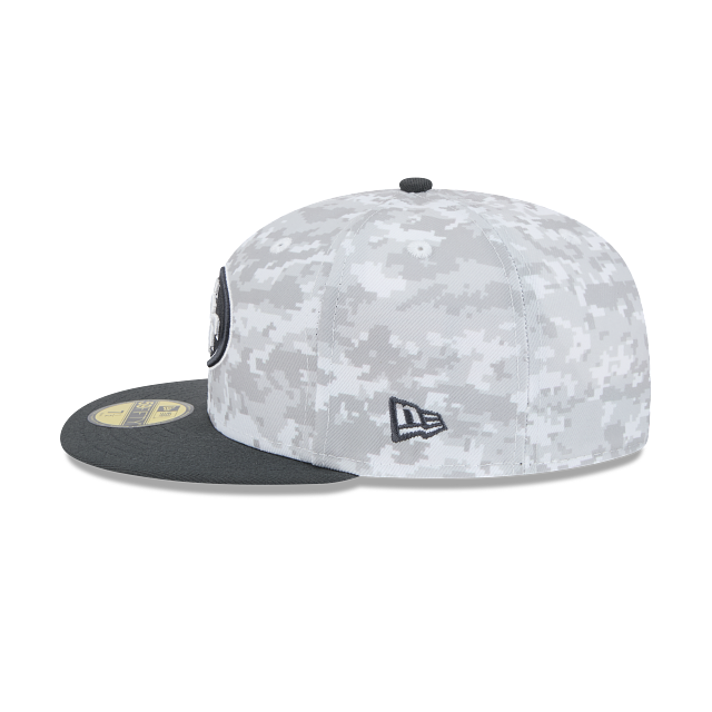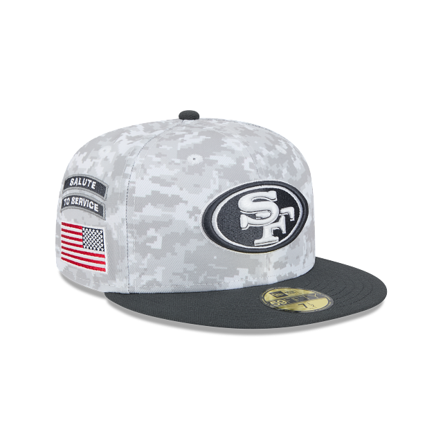 Esta gorra plana New Era 59FIFTY de San Francisco 49Ers de la colección NFL Salute to Service 2024 presenta un diseño de camuflaje con el logotipo de los 49Ers bordado en los paneles frontales, la bandera de Estados Unidos del lado derecho, el logo de la NFL al reverso y el flag de New Era bordado del lado izquierdo. Apoya a tu equipo y cómprala ya.