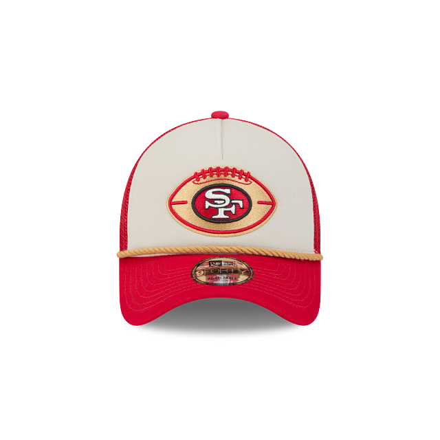 Esta gorra curva New Era 9FORTY AF de San Francisco 49Ers de la colección NFL Sideline Historic 2024 presenta un diseño con el logotipo histórico de los 49Ers dentro de un balón de futbol americano bordado en los paneles frontales, una decoración de cuerda trenzada en el visor, malla trucker y el logo de la NFL al reverso y el flag de New Era bordado del lado izquierdo. Apoya a tu equipo y cómprala ya.