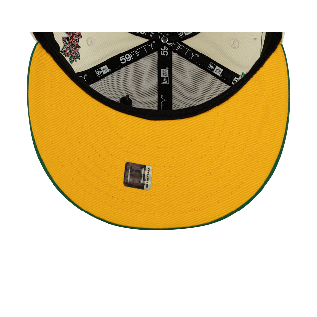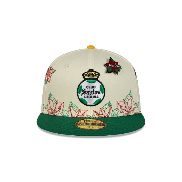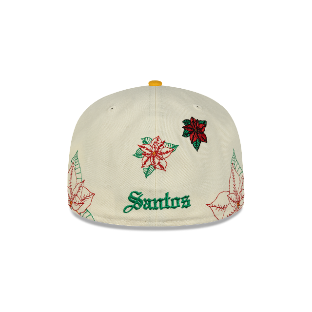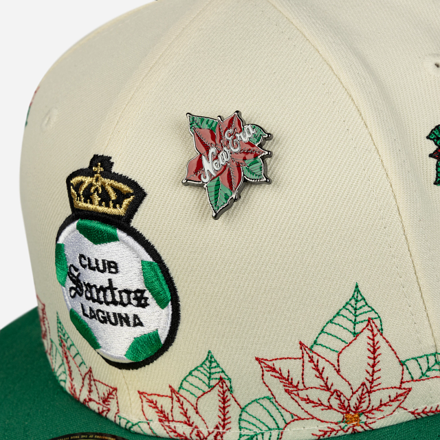 Esta gorra plana New Era 59FIFTY de Santos Laguna de la colección Futbol Mexicano Nochebuena presenta un diseño con el logotipo de los Santos bordado en los paneles frontales junto con un pin en forma de flor de nochebuena, hojas de nochebuena en toda la corona, un parche representativo del equipo del lado derecho, el nombre del equipo al reverso y el flag de New Era bordado del lado izquierdo. Cómprala ya.