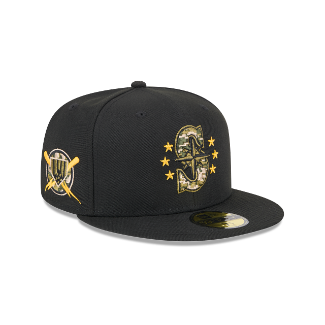 Rinde homenaje a las fuerzas armadas con esta gorra New Era 59FIFTY de Seattle Mariners de la colección MLB Armed Forces Day 2024 que presenta un diseño negro con el logotipo de los Mariners camuflajeado bordado en los paneles frontales rodeado de estrellas, un parche conmemorativo del lado derecho, undervisor verde, el MLB Batterman al reverso y el flag de New Era bordado en el lado izquierdo. Cómprala ya.