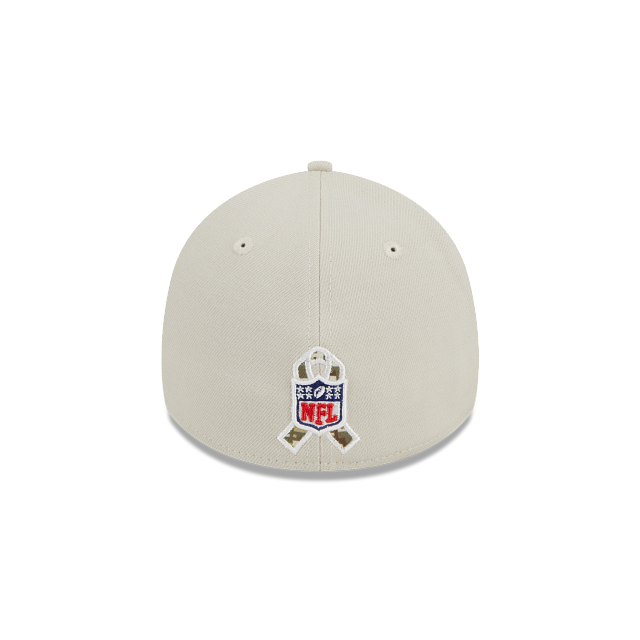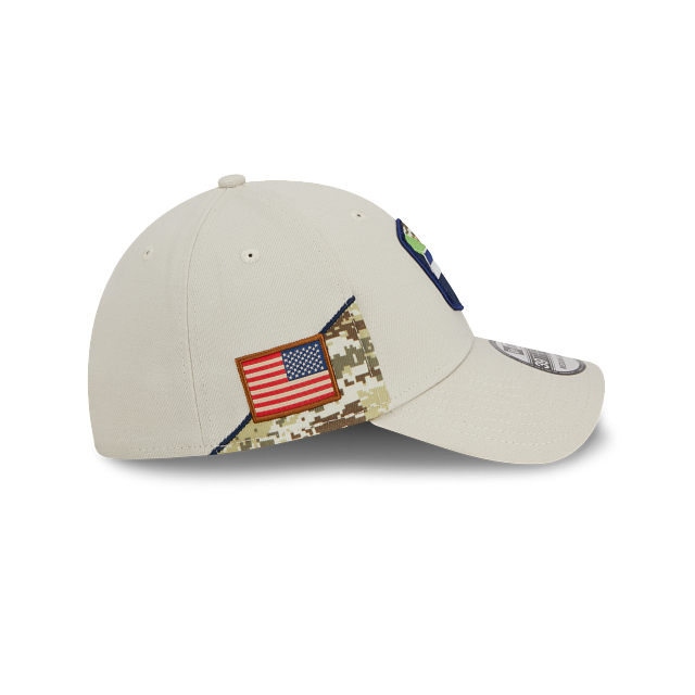 Esta gorra New Era 39THIRTY de Seattle Seahawks de la colección NFL Salute to Service 2023 presenta un diseño de corona beige con el logotipo de los Seahawks bordado en los paneles frontales, la bandera de Estados Unidos del lado derecho, undervisor camuflaje, el logo de la NFL al reverso y el flag de New Era en el lado izquierdo. Cómprala ya.