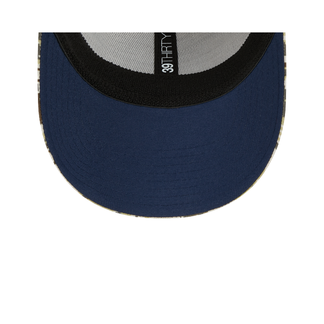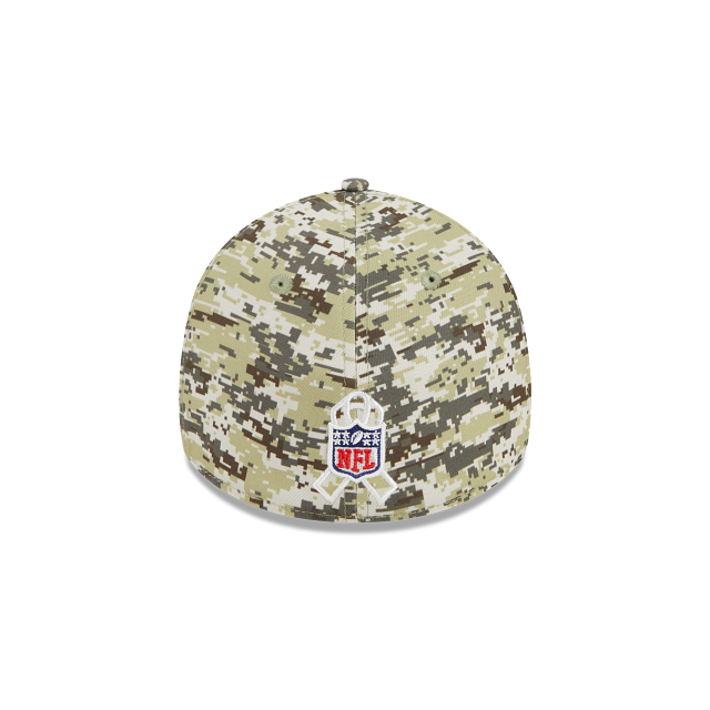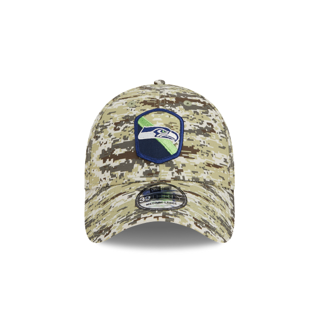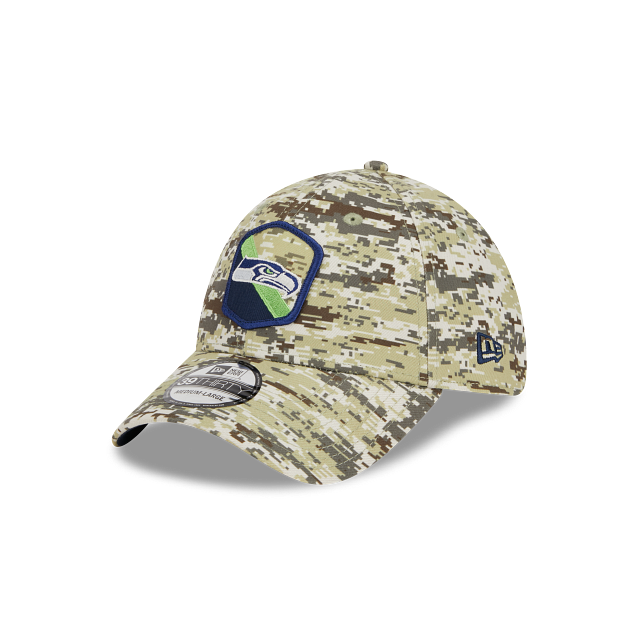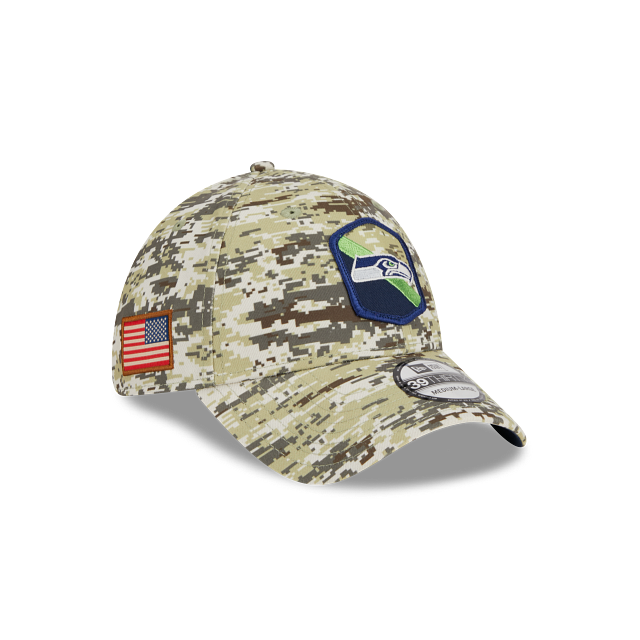 Esta gorra New Era 39THIRTY de Seattle Seahawks de la colección NFL Salute to Service 2023 presenta un diseño en camuflaje con el logotipo de los Seahawks bordado en los paneles frontales, la bandera de Estados Unidos del lado derecho, el undervisor del color del equipo, el logo de la NFL al reverso y el flag de New Era bordado en el lado izquierdo. Cómprala ya.