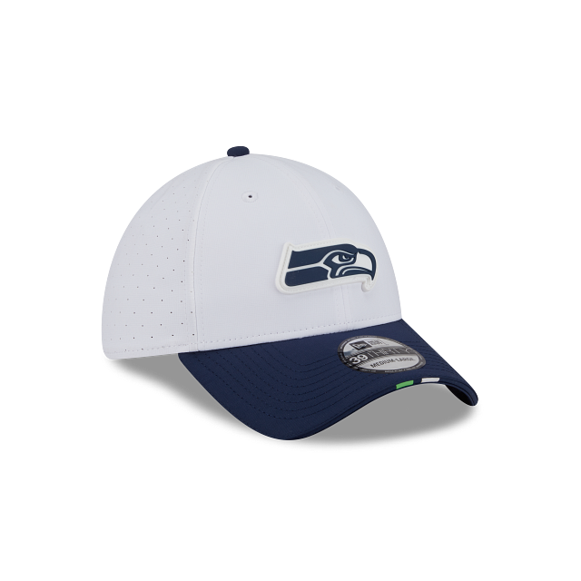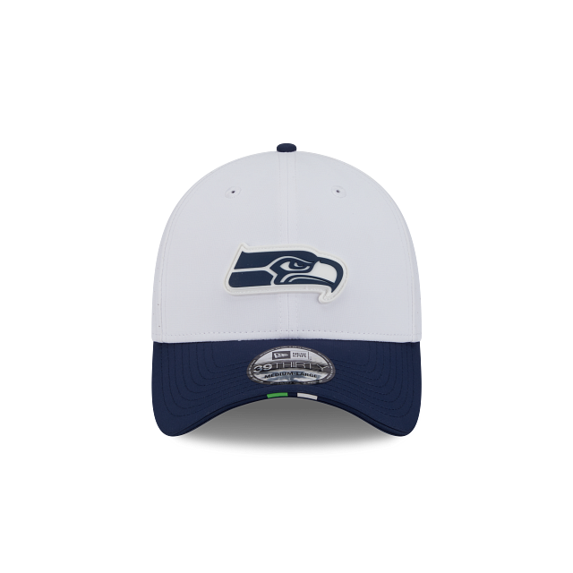 Esta gorra curva New Era 39THIRTY de Seattle Seahawks de la colección NFL Training 2025 presenta una corona en color blanco con el logotipo de los Seahawks engomado en los paneles frontales, el logo de la NFL al reverso y el flag de New Era engomado del lado izquierdo. Apoya a tu equipo y cómprala ya.
