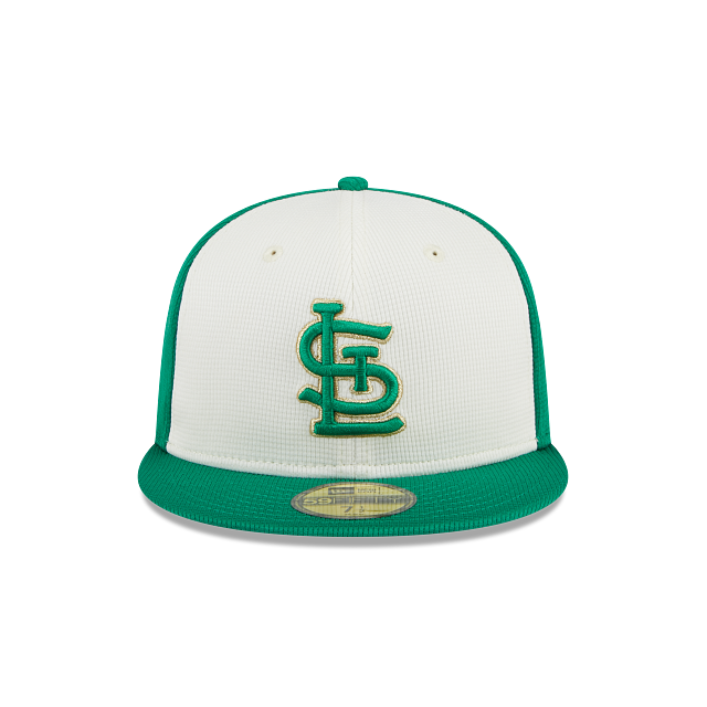 Esta gorra New Era 59FIFTY de St. Louis Cardinals de la colección MLB St. Patrick's Day 2024 presenta el logotipo de los Cardinals con contorno dorado bordado en los paneles frontales en color blanco que contrasta con el clásico verde de la celebración, el MLB Batterman al reverso y el flag de New Era bordado en el lado izquierdo. Cómprala ya.
