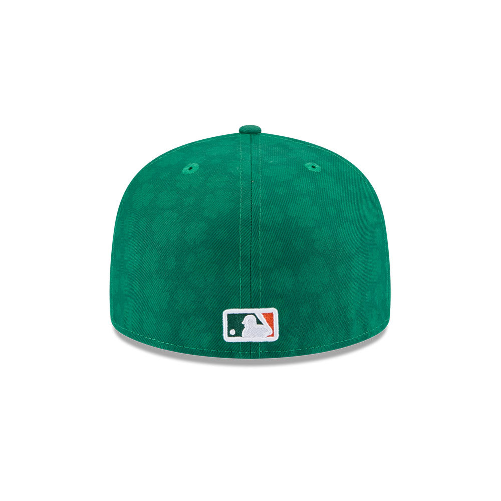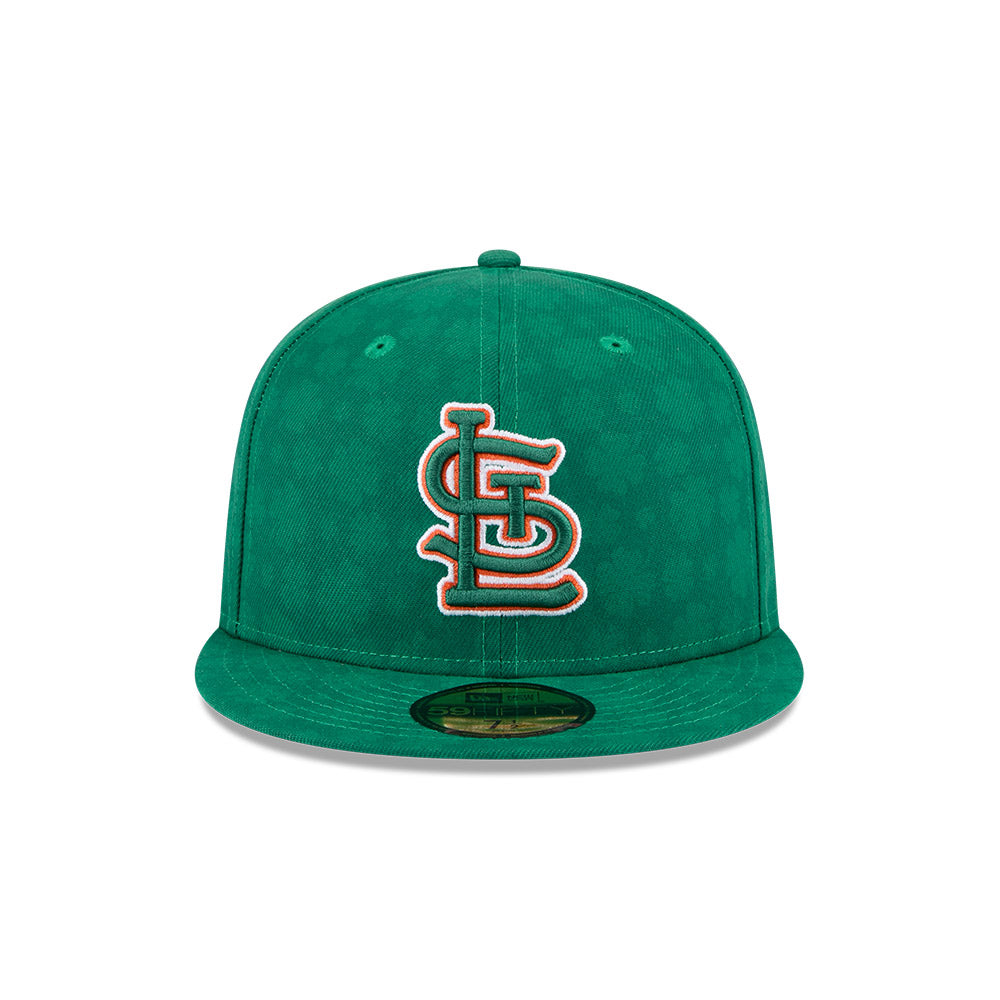 Esta gorra plana New Era 59FIFTY de St. Louis Cardinals de la colección MLB St. Patrick's Day 2025 presenta un diseño con el clásico verde de la celebración acompañado de un patrón de tréboles de cuatro hojas en toda la corona y visor, el logotipo de los Cardinals bordado en los paneles frontales, el MLB Batterman al reverso y el flag de New Era bordado del lado izquierdo. Cómprala ya.