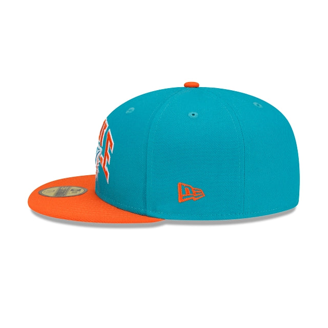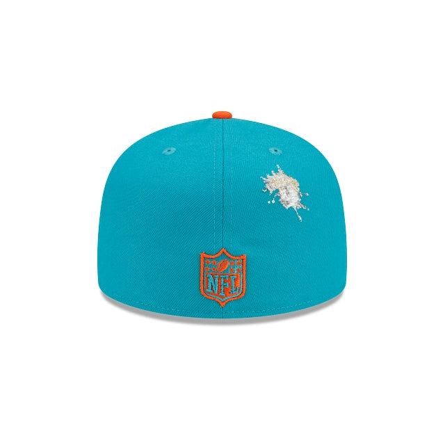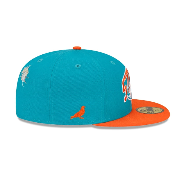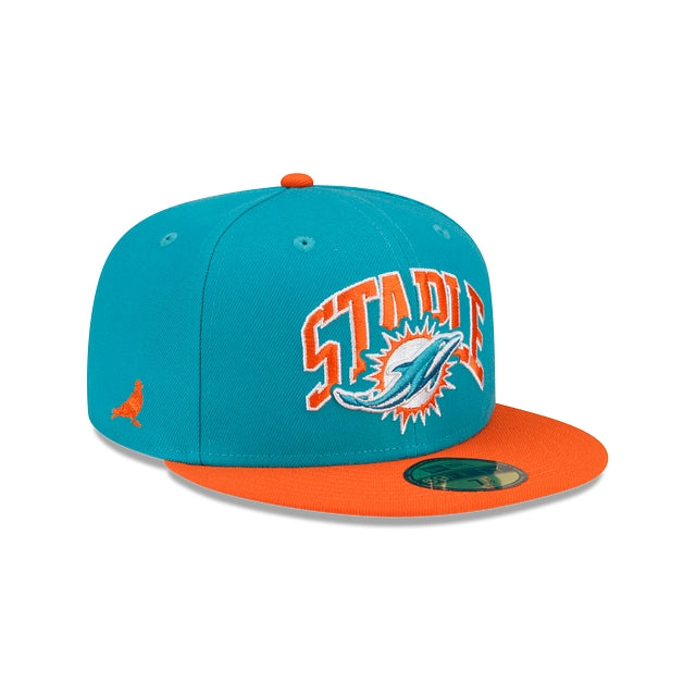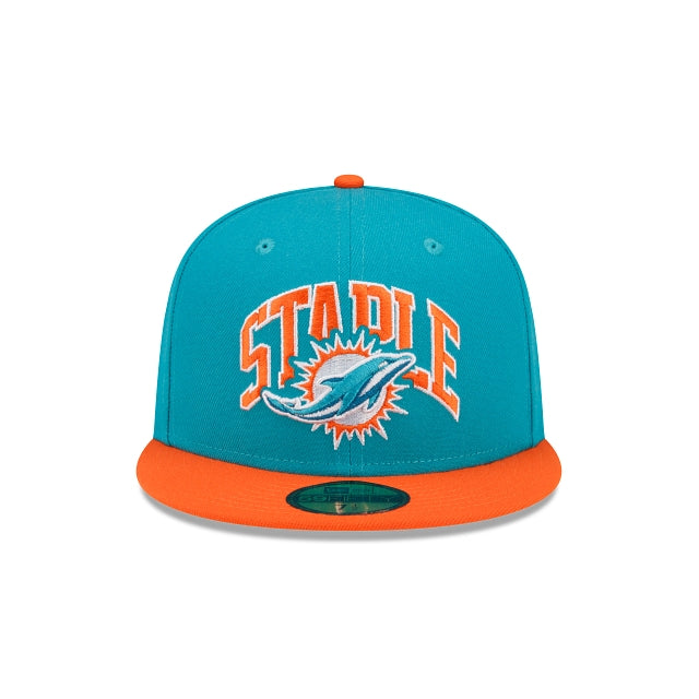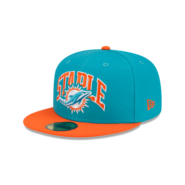 Esta gorra New Era 59FIFTY de Miami Dolphins de la colección Staple X NFL presenta el logo de los Dolphins bordado en los paneles frontales entre un script oversize de Staple, el logo de Staple Pigeon en el lado derecho y el logo de la NFL a juego con un bordado inspirado en Staple en la parte trasera. Cómprala ya.