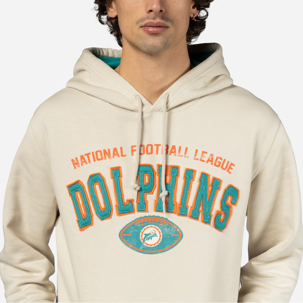 Esta Sudadera New Era de Miami Dolphins de la colección NFL 3rd Down Historic presenta un diseño con el nombre y dentro de un balón de futbol americano el logotipo retro de los Dolphins bordado en la parte frontal y el flag de New Era bordado en la manga izquierda. Luce con estilo y cómprala ya.