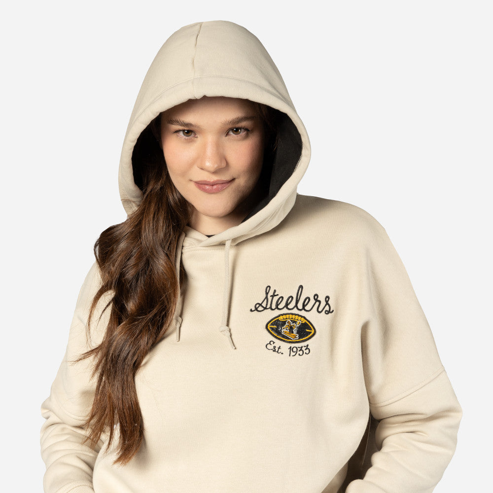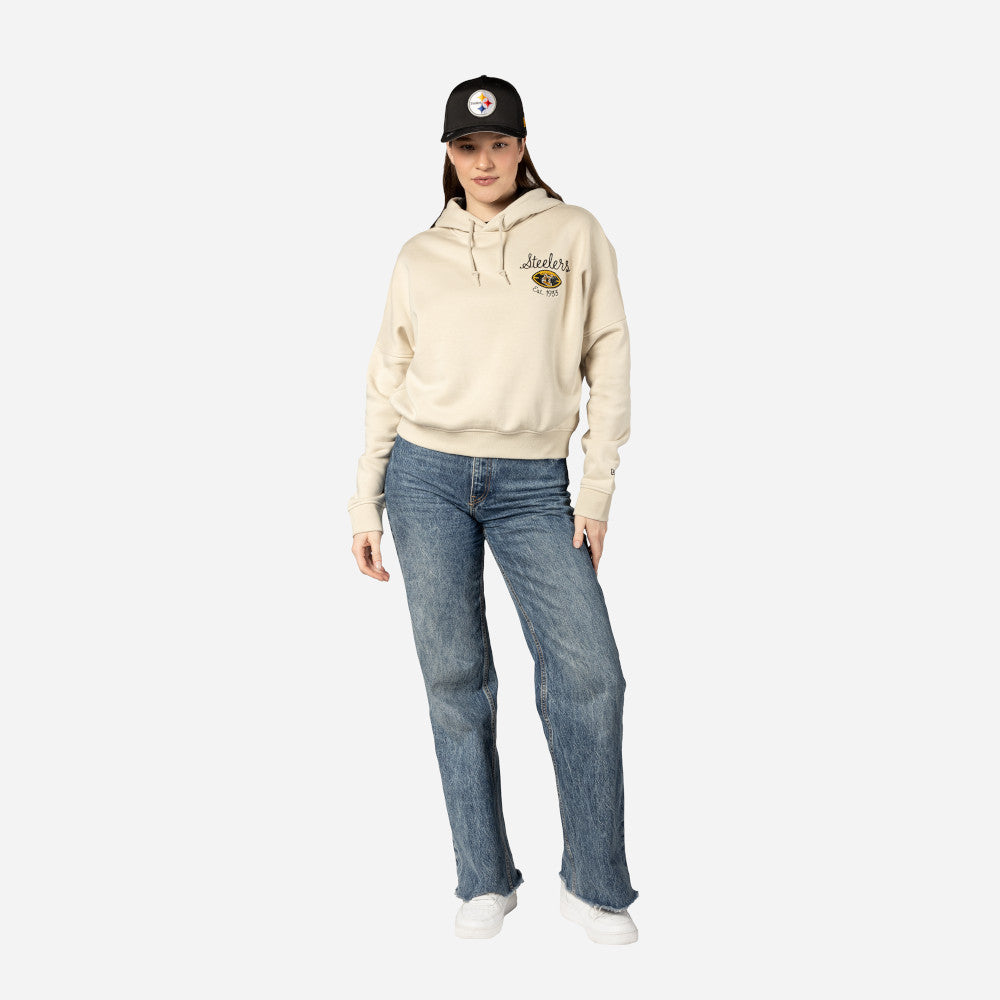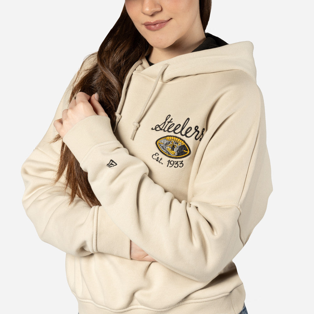 Esta Sudadera New Era para Mujer de Pittsburgh Steelers de la colección NFL 3rd Down Historic presenta un diseño con el nombre y dentro de un balón de futbol americano el logotipo retro de los Steelers bordado en la parte frontal izquierda y el flag de New Era bordado en la manga izquierda. Luce con estilo y cómprala ya.