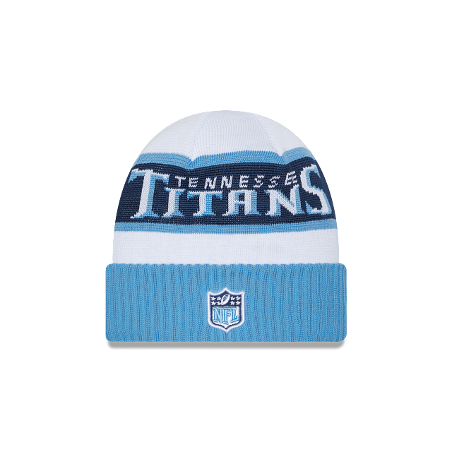 Este New Era Knit de Tennessee Titans de la colección NFL Sideline presenta el logotipo del equipo bordado en la parte frontal, el logo de la NFL en la parte trasera, el nombre de los Titans en la parte alta, y el flag de New Era en el lado izquierdo. Apoya a tu equipo y cómpralo ya.