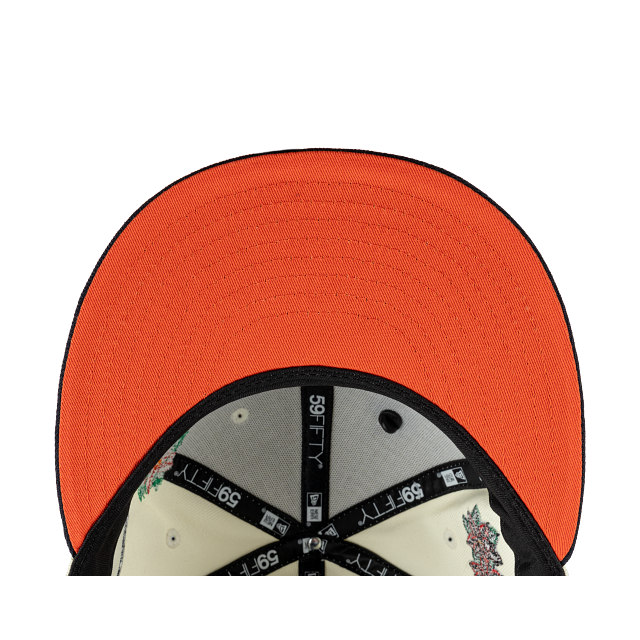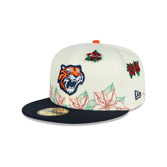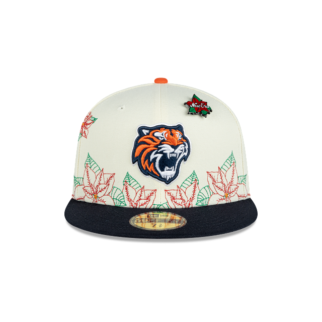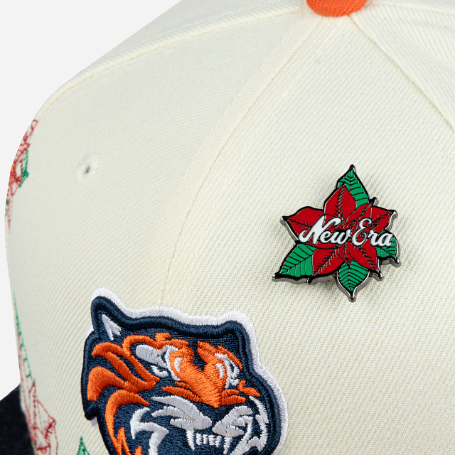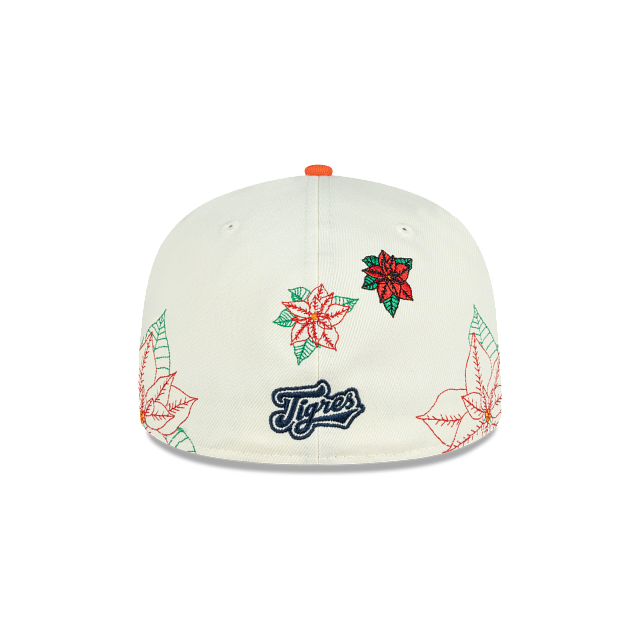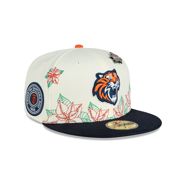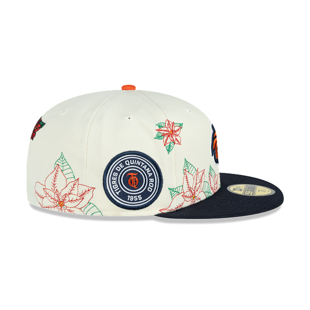 Esta gorra plana New Era 59FIFTY de Tigres de Quintana Roo de la colección LMB Nochebuena presenta un diseño con el logotipo de los Tigres bordado en los paneles frontales junto con un pin en forma de flor de nochebuena, hojas de nochebuena en toda la corona, un parche representativo del equipo del lado derecho, el nombre del equipo al reverso y el flag de New Era bordado del lado izquierdo. Cómprala ya.