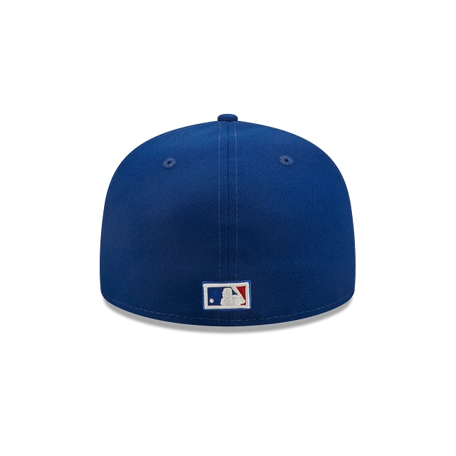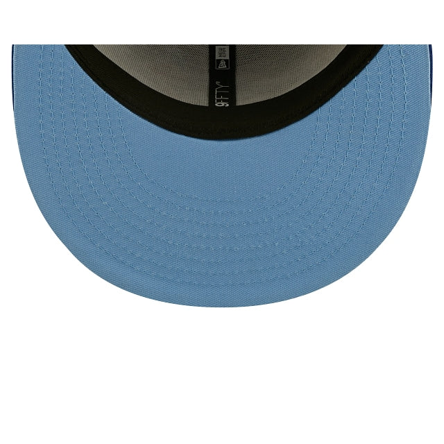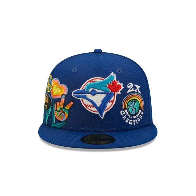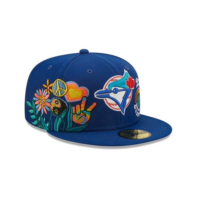 Esta 59FIFTY de Toronto Blue Jays de la colección Groovy presenta el logotipo de los Jays bordado en los paneles frontales a juego con un parche de World Series Champions y un diseño de peace and love floral en el lado derecho. Detalles adicionales incluyen undervisor azul. Cómprala ya.