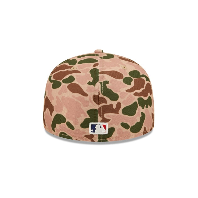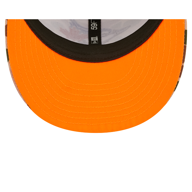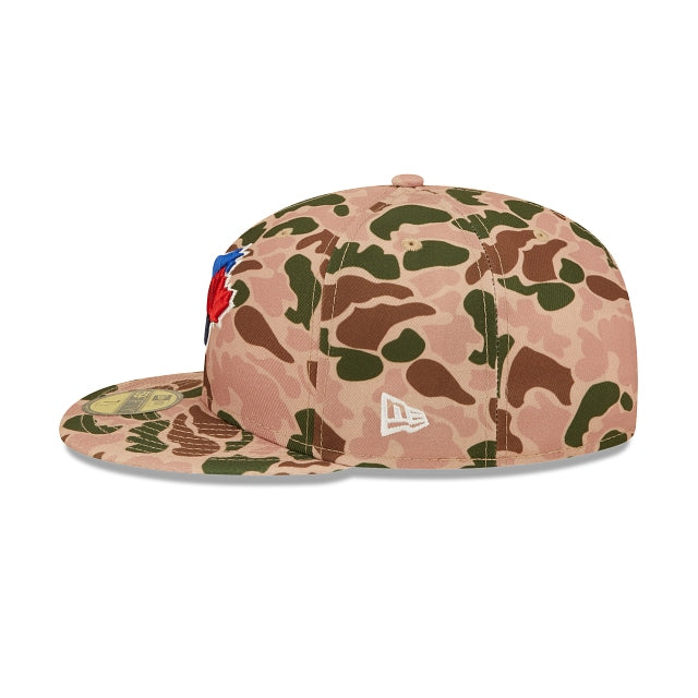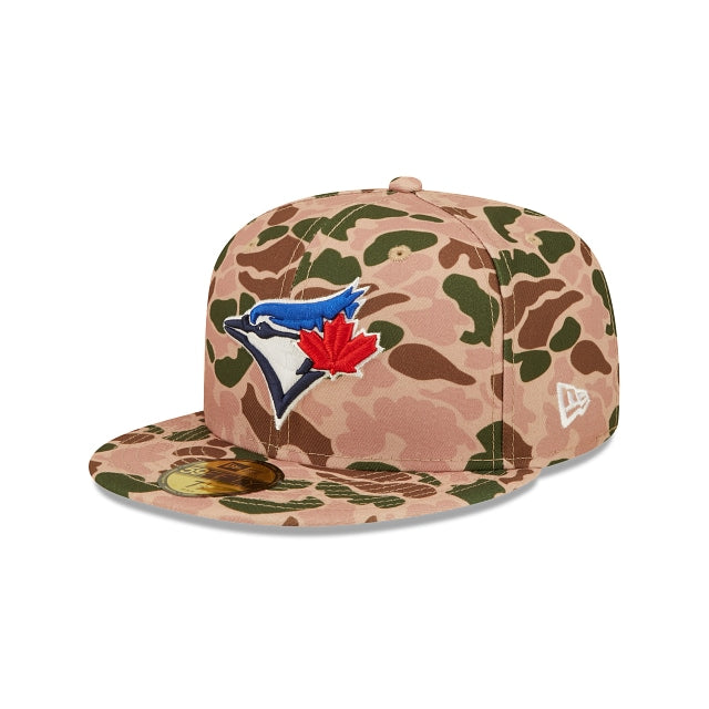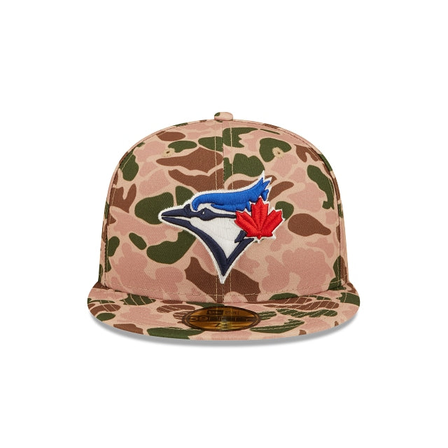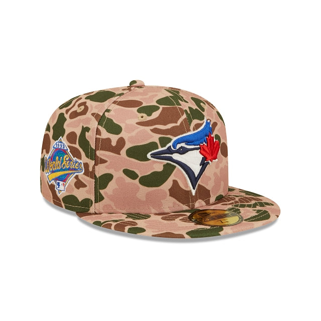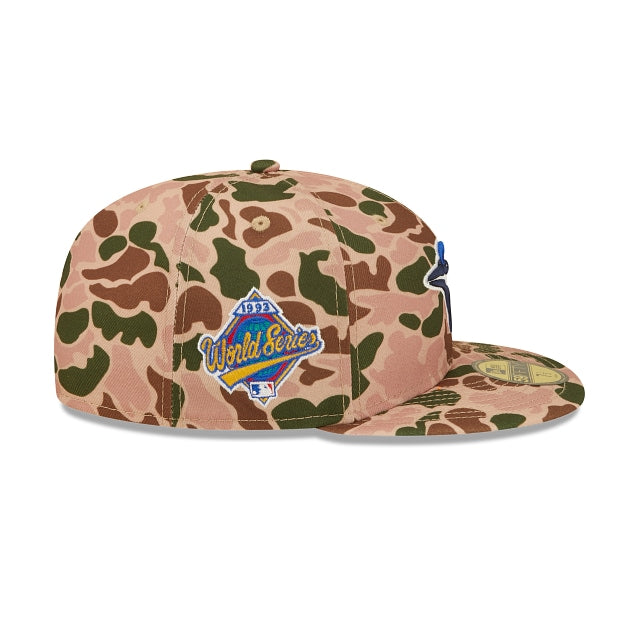 Esta gorra New Era 59FIFTY de Toronto Blue Jays MLB Duck Camo presenta una confección de camuflaje de pato con el logotipo de los Blue Jays bordado en los paneles frontales, un parche lateral de World Series bordado en el lado derecho y el logotipo de MLB Batterman en la parte trasera. Los detalles adicionales incluyen el undervisor rosa. Cómprala ya.